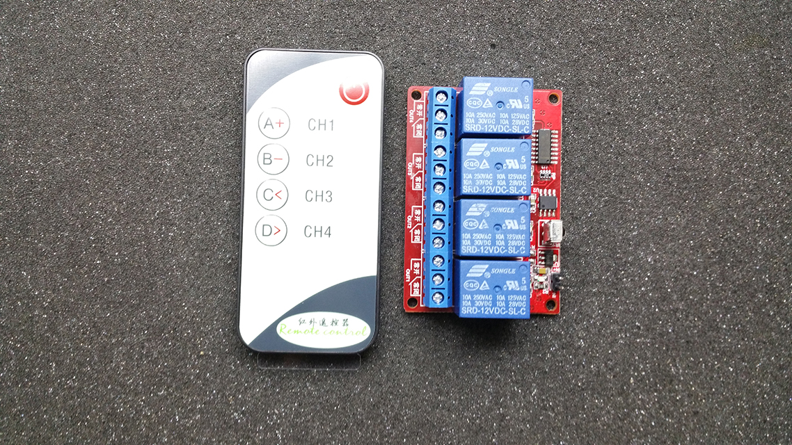 4 kanálkový relé modul (12V napájecí napětí) + dálkový infra ovladač včetně knoflíkové baterie